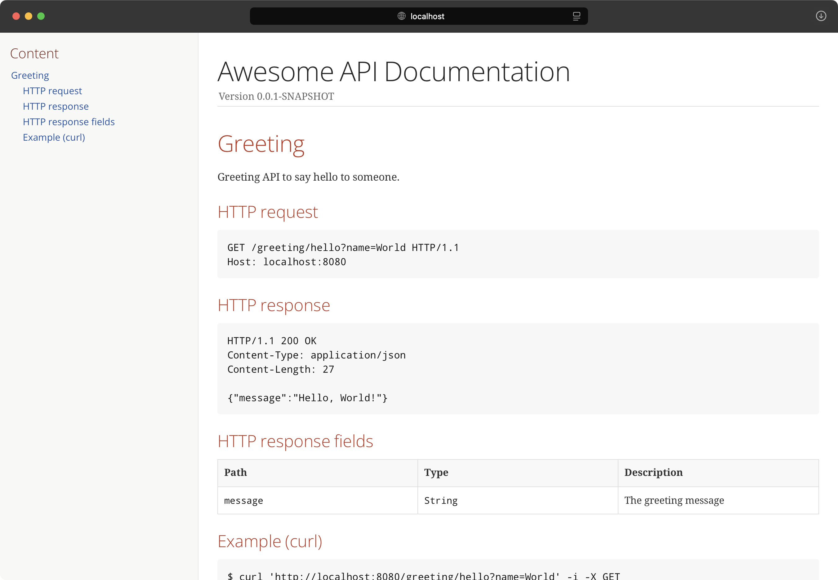 responseFields(fieldWithPath("message").description("The greeting message"))));