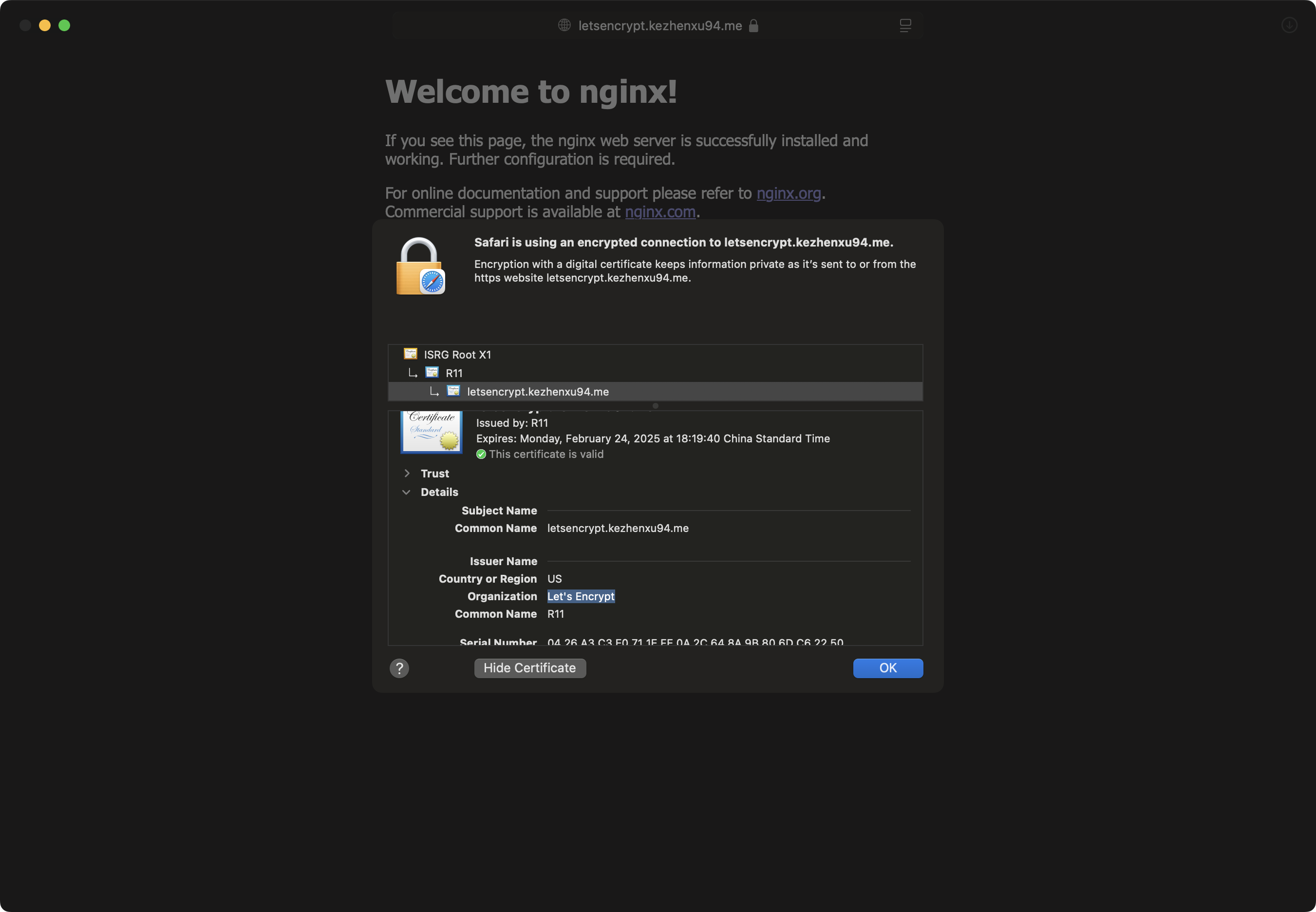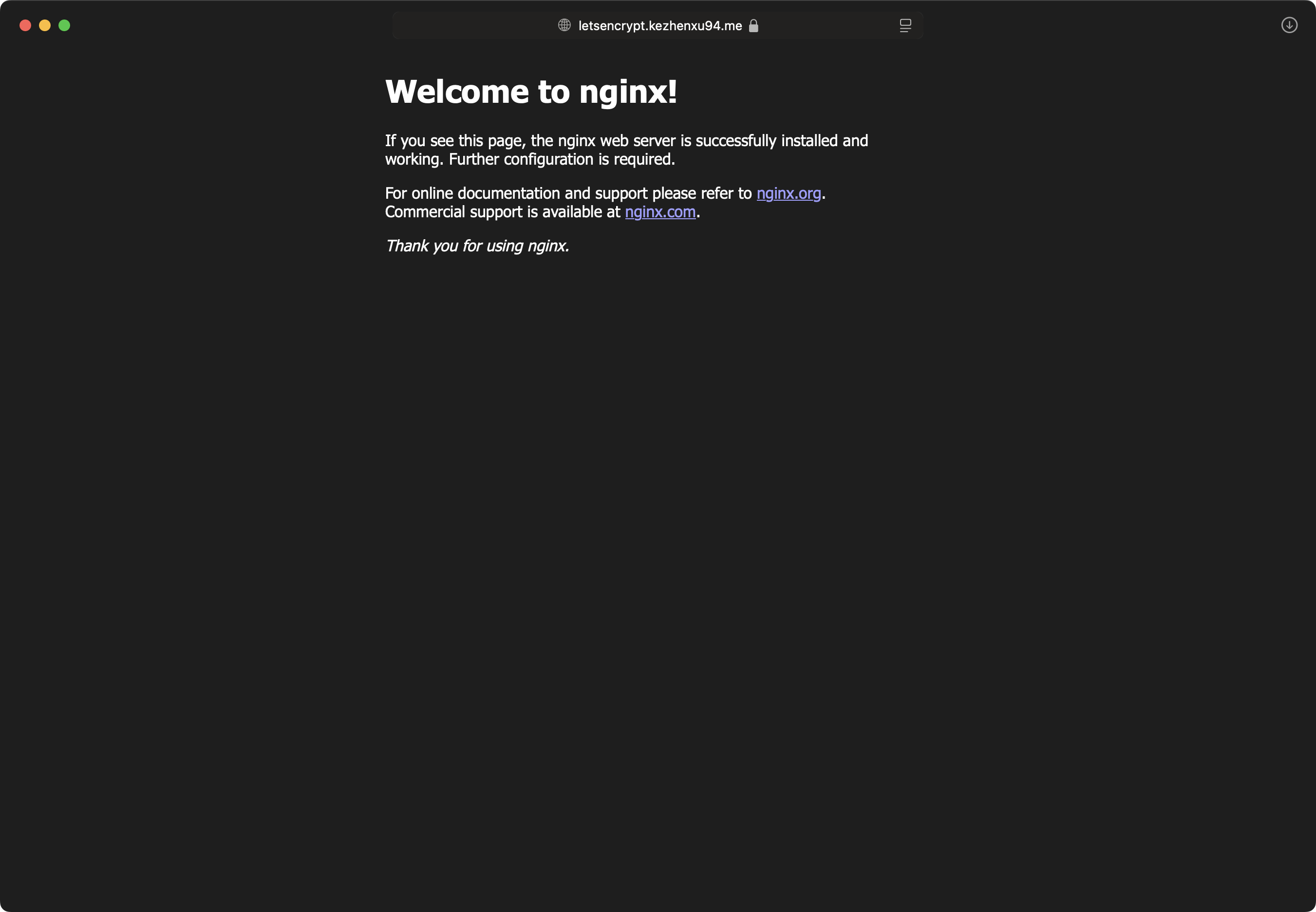 Now you can navigate to your domain https://letsencrypt.kezhenxu94.me in the browser, you should see the default Nginx index page, and the connection is secure with a valid certificate: